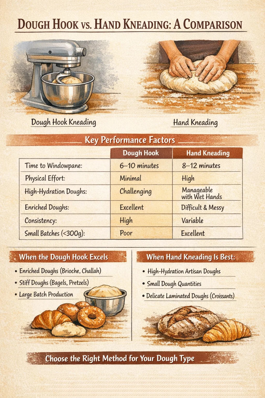Cangkuk doh ialah pengganti yang boleh dipercayai dan praktikal untuk menguli tangan dalam kebanyakan senario pembakar roti. Untuk doh roti standard dalam 60% hingga 72% julat penghidratan , doh diperkaya, doh keras, dan pengeluaran kumpulan besar, ia memberikan hasil yang setara atau unggul dengan usaha fizikal yang jauh lebih sedikit. Perkara utama ialah menggunakan kelajuan yang betul, memantau suhu doh dan mengesahkan pembangunan dengan ujian tingkap daripada bergantung semata-mata pada masa.