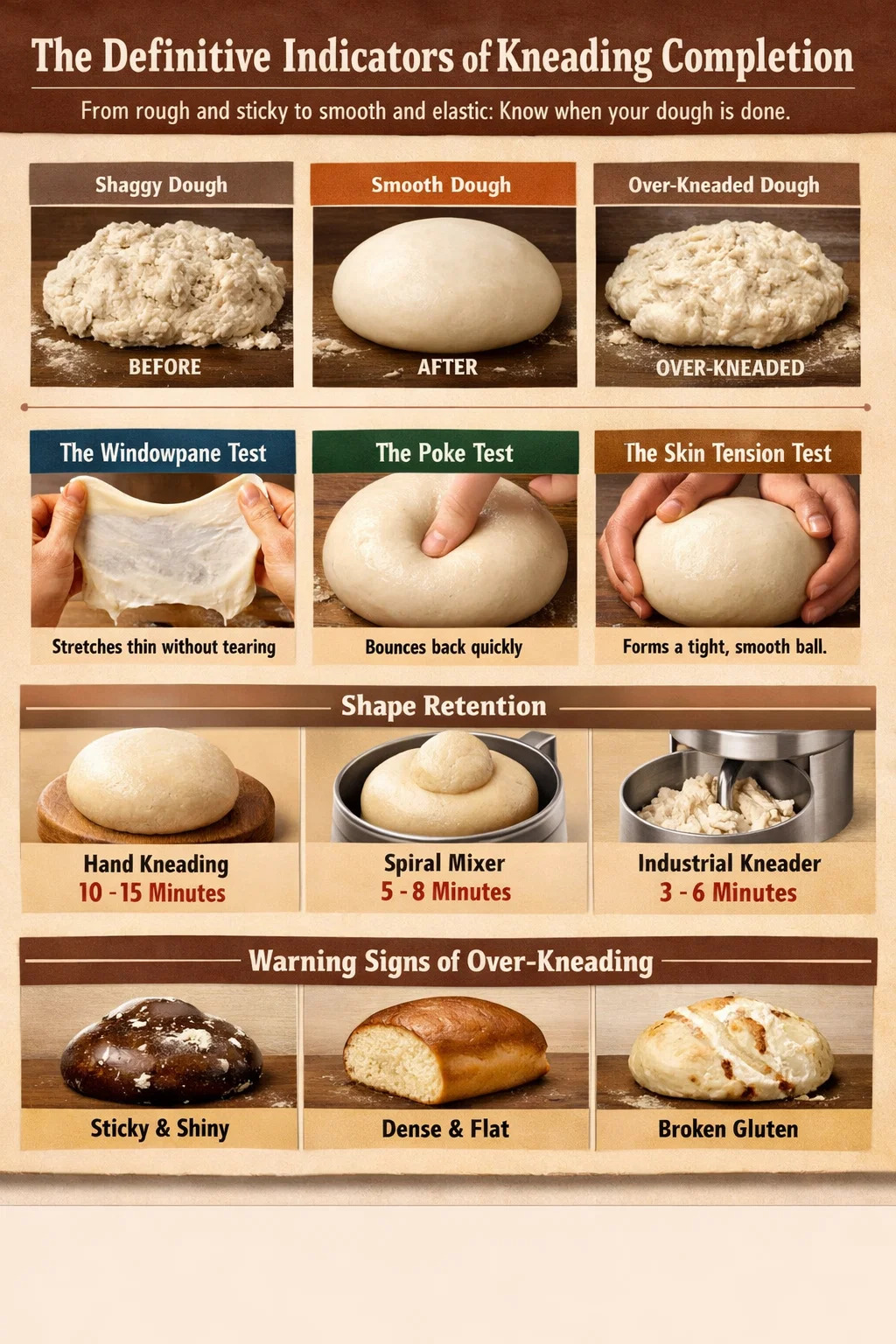 Daripada bergantung semata-mata pada pemasa, yang mungkin tidak tepat disebabkan oleh kelembapan atau kandungan protein tepung, gunakan penanda aras fizikal ini untuk mengesahkan keadaan anda diuli bahan.