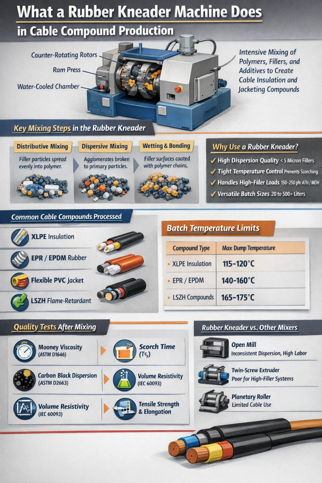 Kompaun penebat kabel dan jaket biasanya mengandungi 15 hingga 30 bahan individu. Mendapatkan setiap bahan—terutamanya pengisi karbon hitam, silika dan kalis nyalaan—diserakkan ke paras zarah utama di bawah 5 mikron secara langsung menentukan sama ada kabel siap itu melepasi ujian kekuatan dielektrik, ujian penuaan dan piawaian perambatan nyalaan seperti IEC 60332 atau UL 1666. Penguli getah yang diperlukan untuk memecah geometri permukaan pemutar dan pemutar permukaan basah. dengan rantai polimer, tugas yang pendekatan pencampuran yang lebih mudah tidak dapat dicapai secara konsisten.